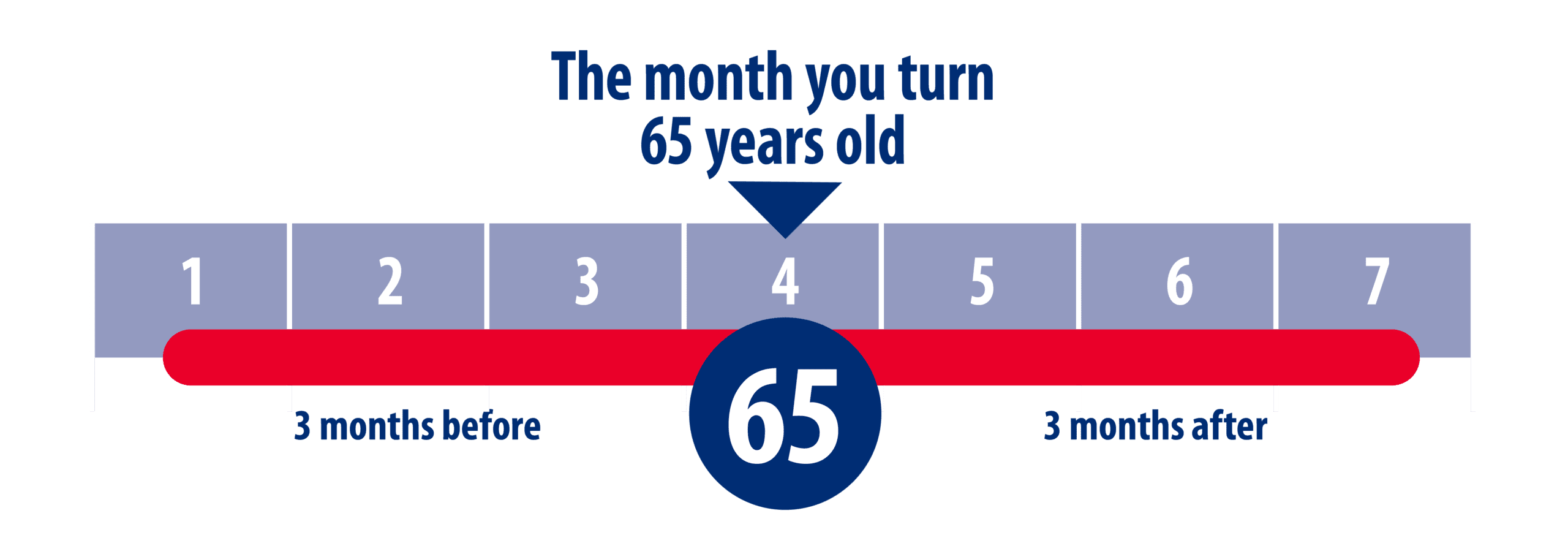 This is the time frame most people sign up for Medicare. A seven-month period, starting three months before the month in which you turn 65 and ending three months after that month (assumes you do not delay enrolling in Medicare Part B plan).